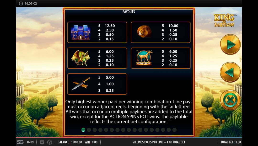 There are 20 paylines in King of Babylon Action Spins. You must land 2–5 or 3–5 matching symbols adjacently (depending on the symbol), starting from the first reel on the left, to receive a payout during the base game or free spins. You can also look forward to bonus payouts of varying sizes thanks to the Action Spins feature. For a potential edge, consider taking advantage of some of the best strategies for playing slot machines.